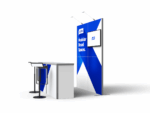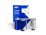 Im vorderen Bereich des Messestands sorgen zwei stabile Messetheken für zusätzliche Präsentationsfläche. Die Theken sind auf der Vorderseite und den Seiten mit bedruckten Paneelen versehen, die sich nahtlos in das Design des Messestands einfügen. So kannst du deine Marke konsequent und stilvoll präsentieren.