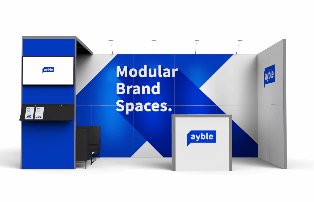 Wie alle ayble Messestände überzeugt auch dieses Set durch seine eloxierten Aluminiumrahmen und die magnetisch befestigten Grafikpaneele, die einen schnellen Motivwechsel ermöglichen. Der werkzeuglose Aufbau sorgt für eine unkomplizierte Montage, sodass du deinen Stand effizient und flexibel nutzen kannst.