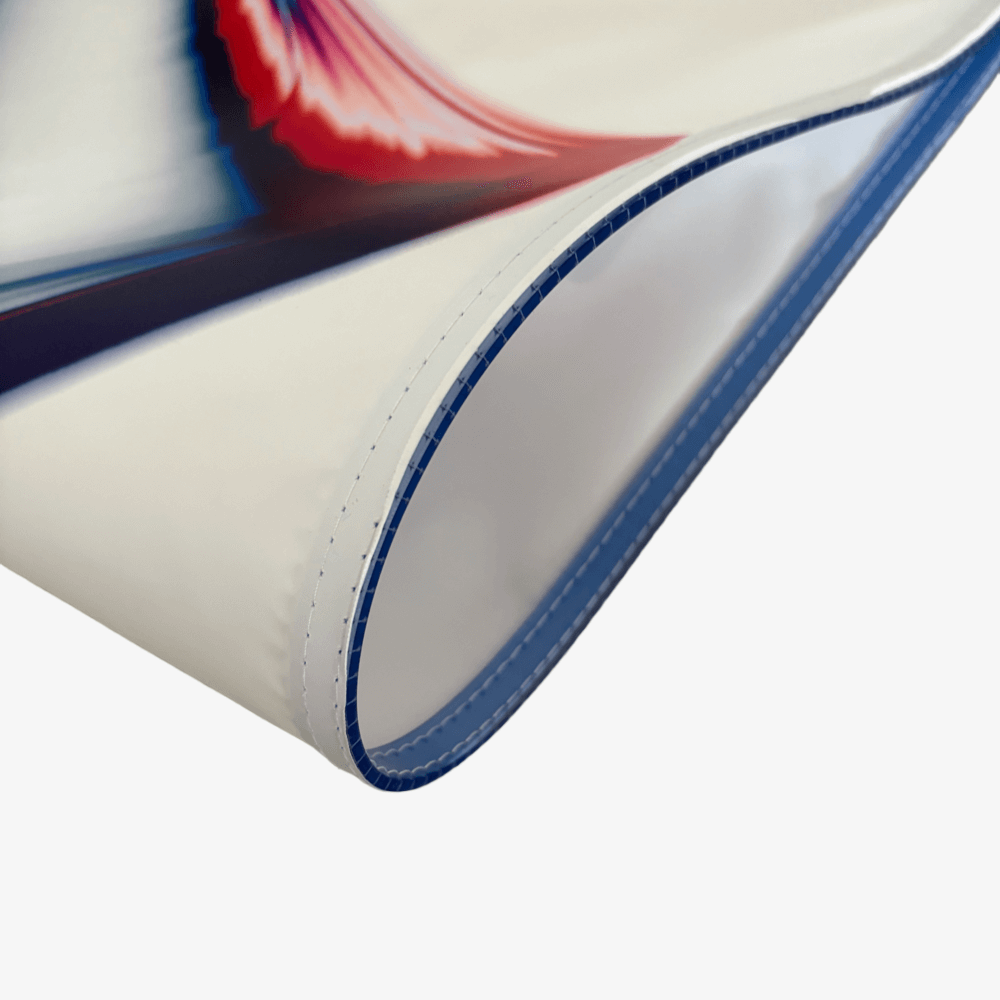 Die Grafik ist knitterarm und damit bestens für den mobilen Einsatz geeignet, z. B. auf Messen, Events, Promotions oder im Point-of-Sale. Durch den umlaufenden Gummikeder lässt sich der Druck ohne Werkzeug in wenigen Sekunden einspannen – straff, sauber und sicher fixiert.