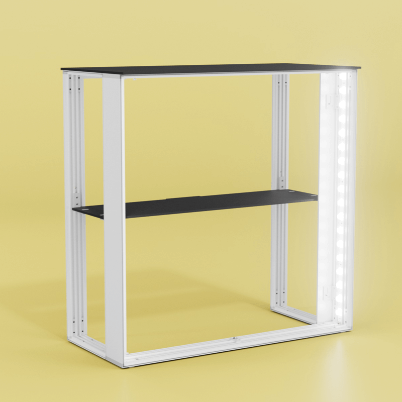 Im Inneren findest du ein praktisches Zwischenfach für deine Unterlagen, Giveaways oder technisches Zubehör. Optional lässt sich der Counter mit abschließbaren Türen ausstatten, um sensible Inhalte sicher zu verstauen. So wird aus einer beleuchteten Messetheke ein vollwertiges Messemöbel mit Mehrwert.