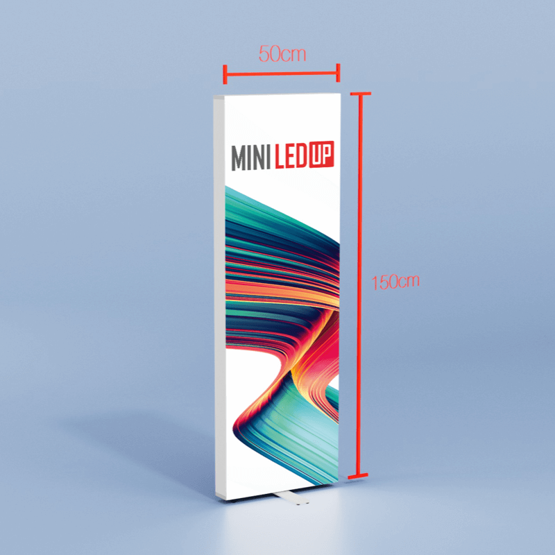 Der MINI LEDUP Leuchtrahmen – 50 cm Breite – bietet dir eine kompakte, leichte und zugleich beeindruckende Lösung für deine Werbebotschaften. Mit seinem brillanten Textildruck, der einfachen Handhabung und der nachhaltigen Verpackung setzt er neue Standards als kleine, mobile LED Messewand für Präsentationen.