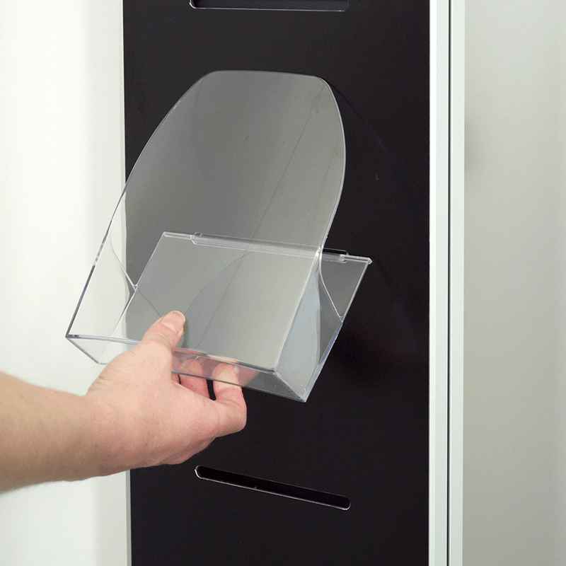 Die pulverbeschichtete, rechteckige Stahlplatte mit Kunststoffabdeckung bietet eine stabile Basis, die für den stationären Einsatz besonders geeignet ist. Der Prospektständer Dacapo iPoint ist ideal für stark frequentierte Bereiche wie Empfangsbereiche, Messen oder Verkaufsräume und bietet beidseitig reichlich Platz für eine flexible Anordnung deiner Informationsmaterialien. So wird dein Informationsmaterial stets professionell und übersichtlich präsentiert.