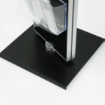 Der Dacapo Twist ist auf einer robusten, rechteckigen Stahlbasis montiert, die mit einer Kunststoffabdeckung versehen ist und für einen sicheren Stand sorgt. Diese solide Konstruktion ist besonders für stark besuchte Bereiche geeignet, in denen eine langlebige und stabile Lösung benötigt wird. Mit seiner drehbaren Funktion bleibt der Prospektständer flexibel und passt sich nahtlos an jede Präsentationsanforderung an.