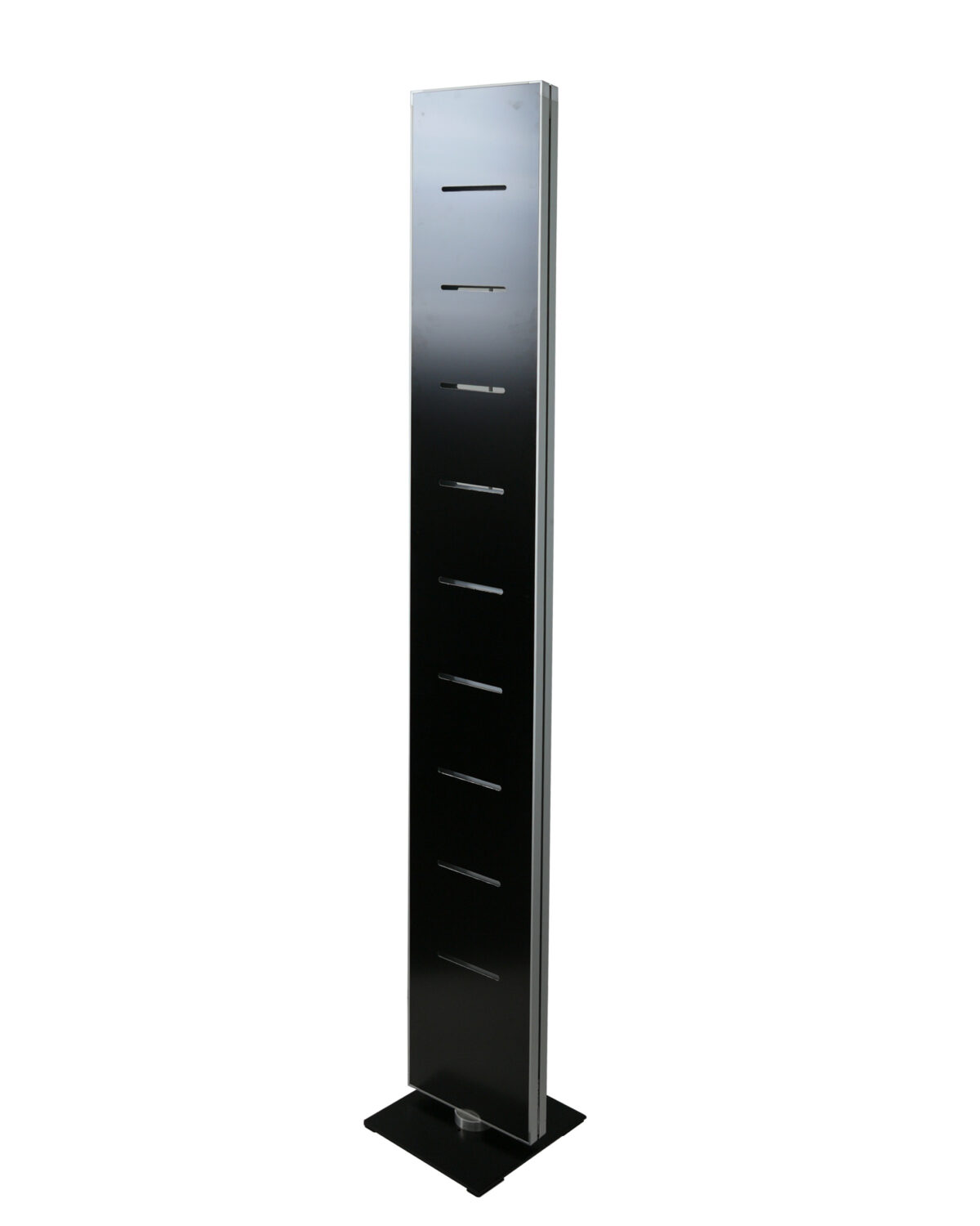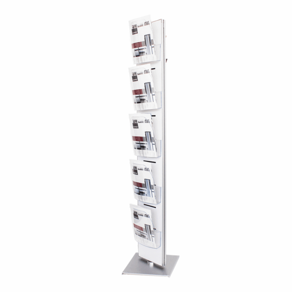 Die integrierten Fräsungen erlauben das einfache Einhängen unserer transparenten Einhänge-Taschen, die separat erhältlich sind und Platz für Informationsmaterial in den Formaten A4, A5 und A6 bieten. Der Dacapo Twist steht stabil auf einer rechteckigen, pulverlackierten Stahlplatte mit Kunststoffabdeckung und eignet sich perfekt für den stationären Einsatz in professionellen Umgebungen. So werden deine Broschüren und Prospekte immer stilvoll und geordnet präsentiert.
