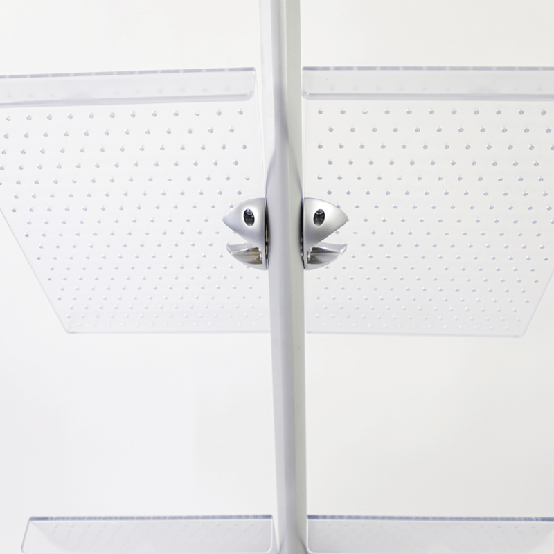Die acht Ablagen des Prospektständers Palo lassen sich frei in der Höhe einstellen, sodass du den Ständer flexibel an die Präsentation deiner Broschüren und Informationsmaterialien anpassen kannst. Die Ablagen aus hochwertigem Polycarbonat-Spritzguss sind besonders widerstandsfähig und kratzsicher, was sie ideal für den professionellen Einsatz in stark frequentierten Bereichen macht. Dank dieser Flexibilität bleibt der Prospektständer Palo stets geordnet und präsentiert deine Materialien auf ansprechende Weise.